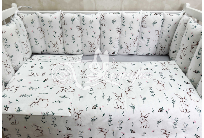 Бортики на замочках в кроватку: защитят Вашего малыша от ушибов, сквозняков, солнечных лучей и не дадут малышу запутаться в прутьях кроватки. - Подушка (100% хлопок- бязь) - 40х60 см.