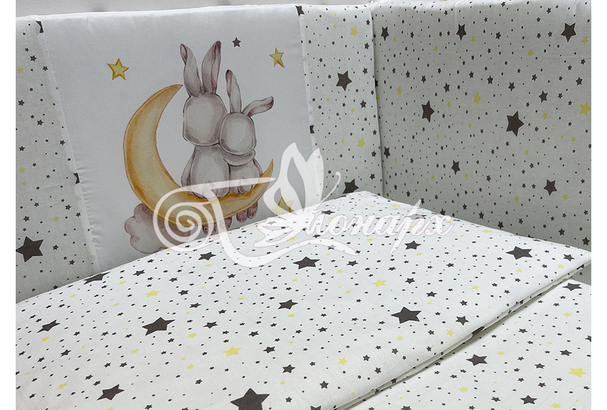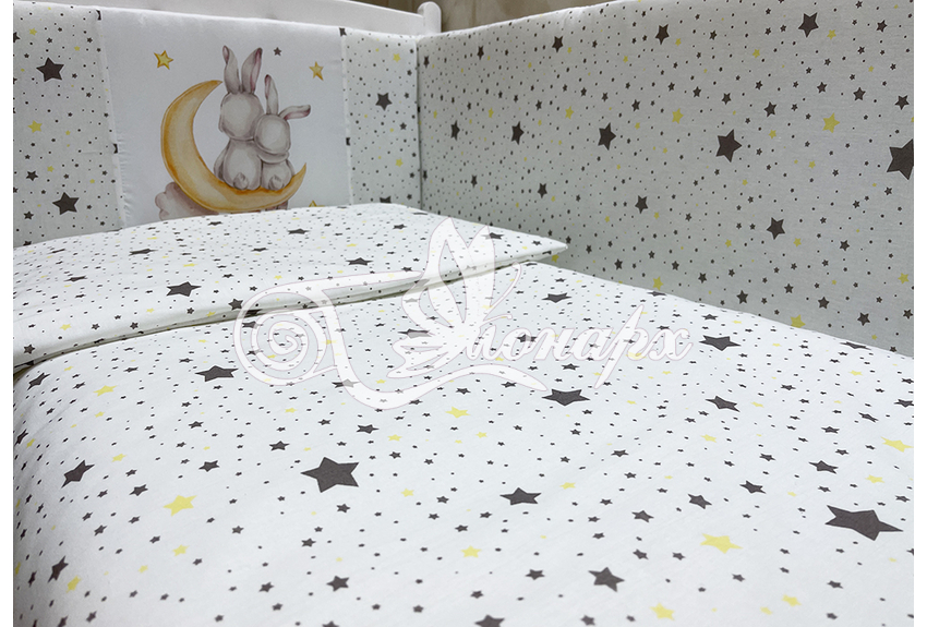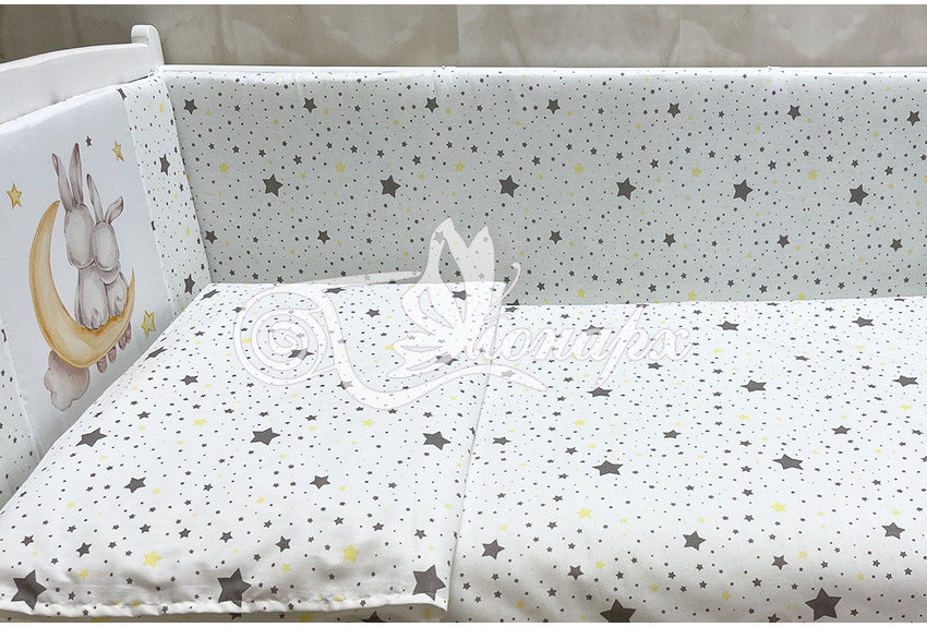 Бортики СО СЪЕМНЫМИ ЧЕХЛАМИ в кроватку: защитят Вашего малыша от ушибов, сквозняков, солнечных лучей и не дадут малышу запутаться в прутьях кроватки. - Простыня на резинке 60х120 см (подходит для стандартной кроватки)