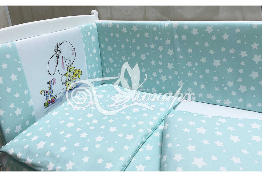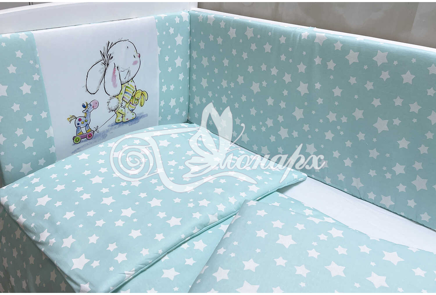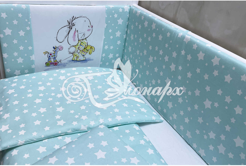 Бортики СО СЪЕМНЫМИ ЧЕХЛАМИ в кроватку: защитят Вашего малыша от ушибов, сквозняков, солнечных лучей и не дадут малышу запутаться в прутьях кроватки. - Простыня на резинке 60х120 см (подходит для стандартной кроватки)