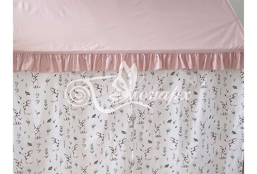 ширина - 137 см + 24 см на рюши (по 12 см на одну сторону). - Занавески с завязками (по 4 завязки на каждой занавеске) на переднюю сторону кроватки 2 шт.: